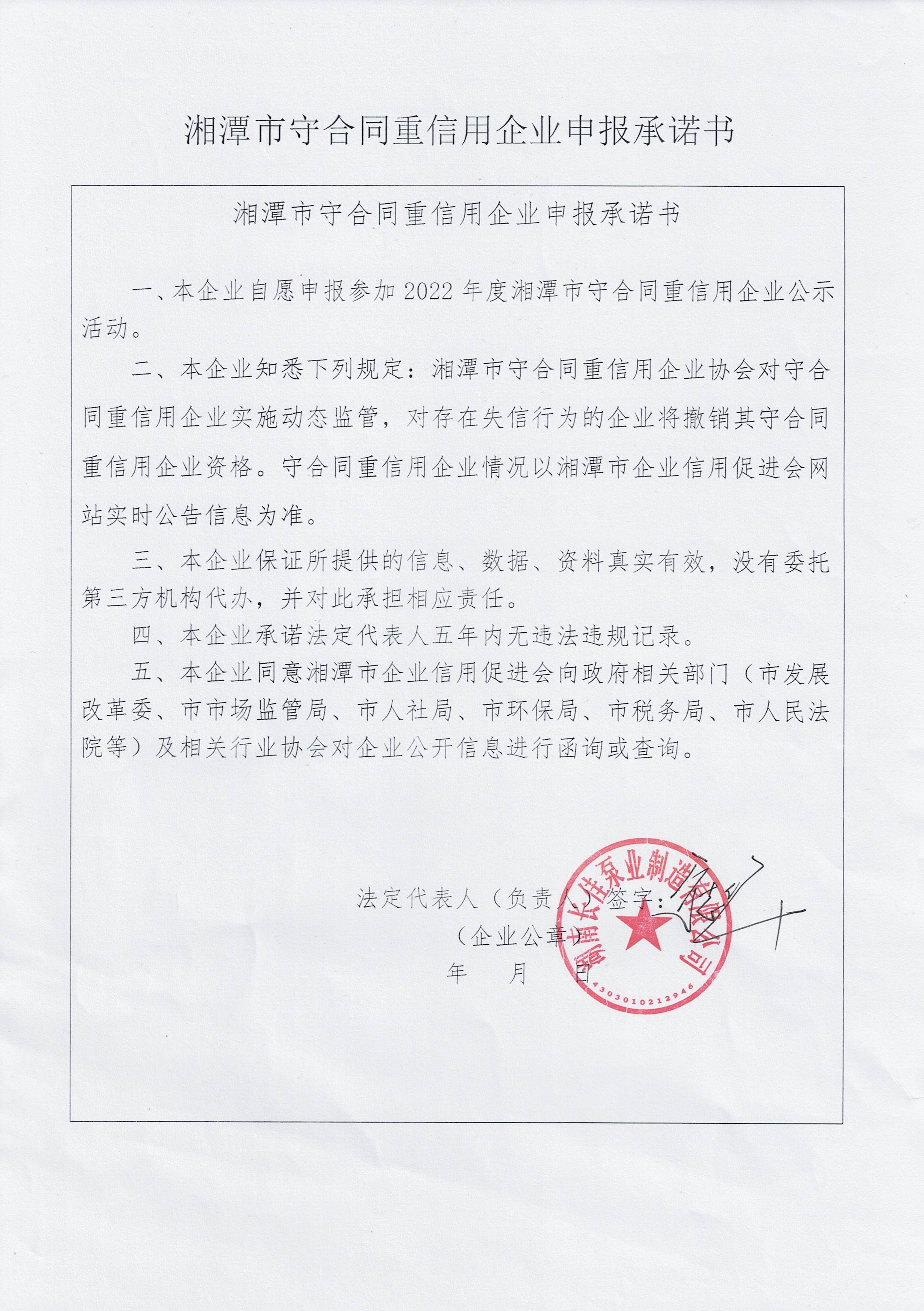 本企業(yè)根據(jù)《湘潭市守合同重信用企業(yè)申報(bào)規(guī)定》等編制 2022 年度企業(yè)信用報(bào)告書,并保證本報(bào)告書內(nèi)容真實(shí)、準(zhǔn)確、完整。
