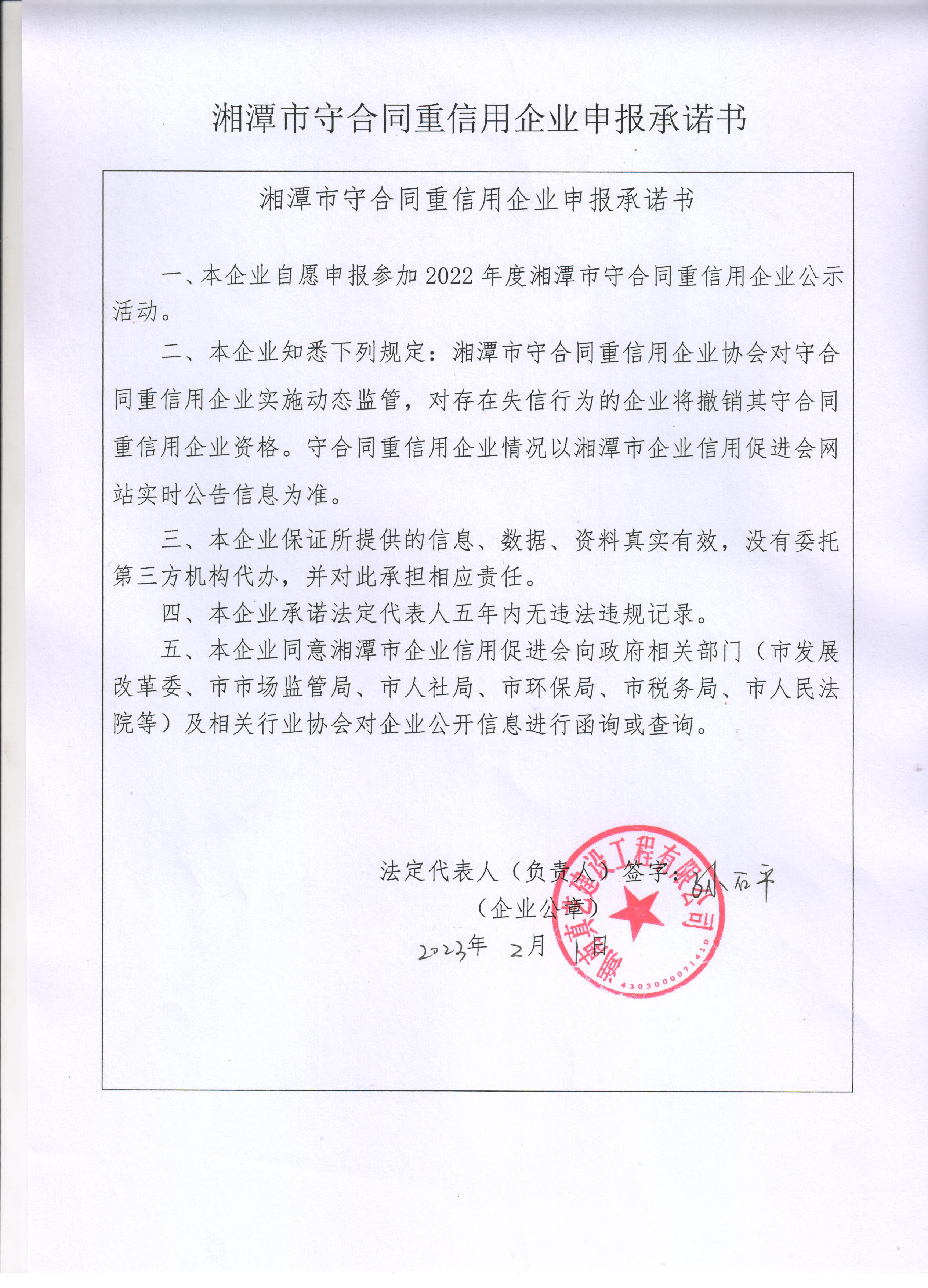 本企業(yè)根據(jù)《湘潭市守合同重信用企業(yè)申報規(guī)定》等編制 2022 年度企業(yè)信用報告書,并保證本報告書內容真實、準確、完整。