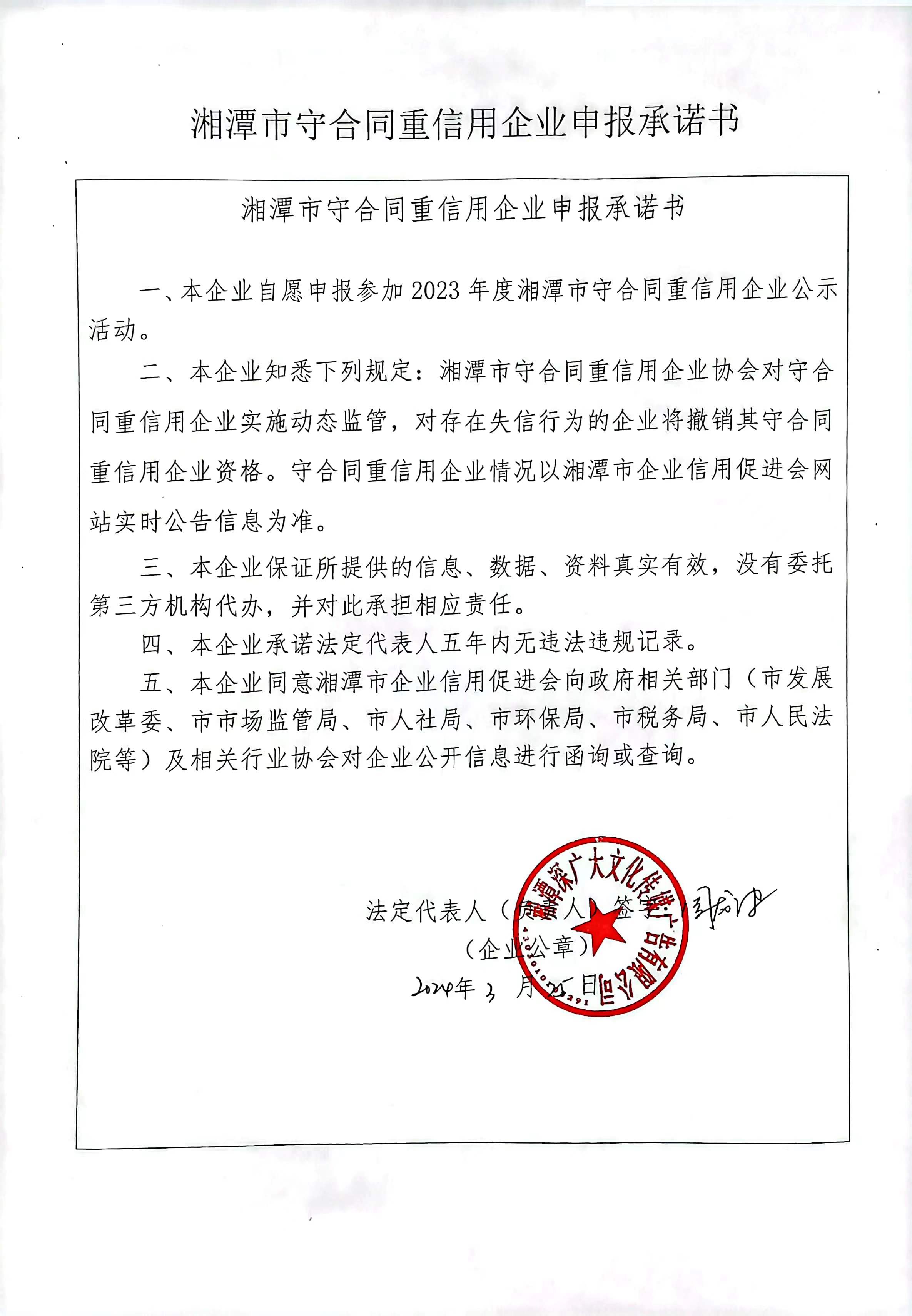 本企業(yè)根據(jù)《湘潭市守合同重信用企業(yè)申報規(guī)定》等編制 2023 年度企業(yè)信用報告書,并保證本報告書內(nèi)容真實、準(zhǔn)確、完整。