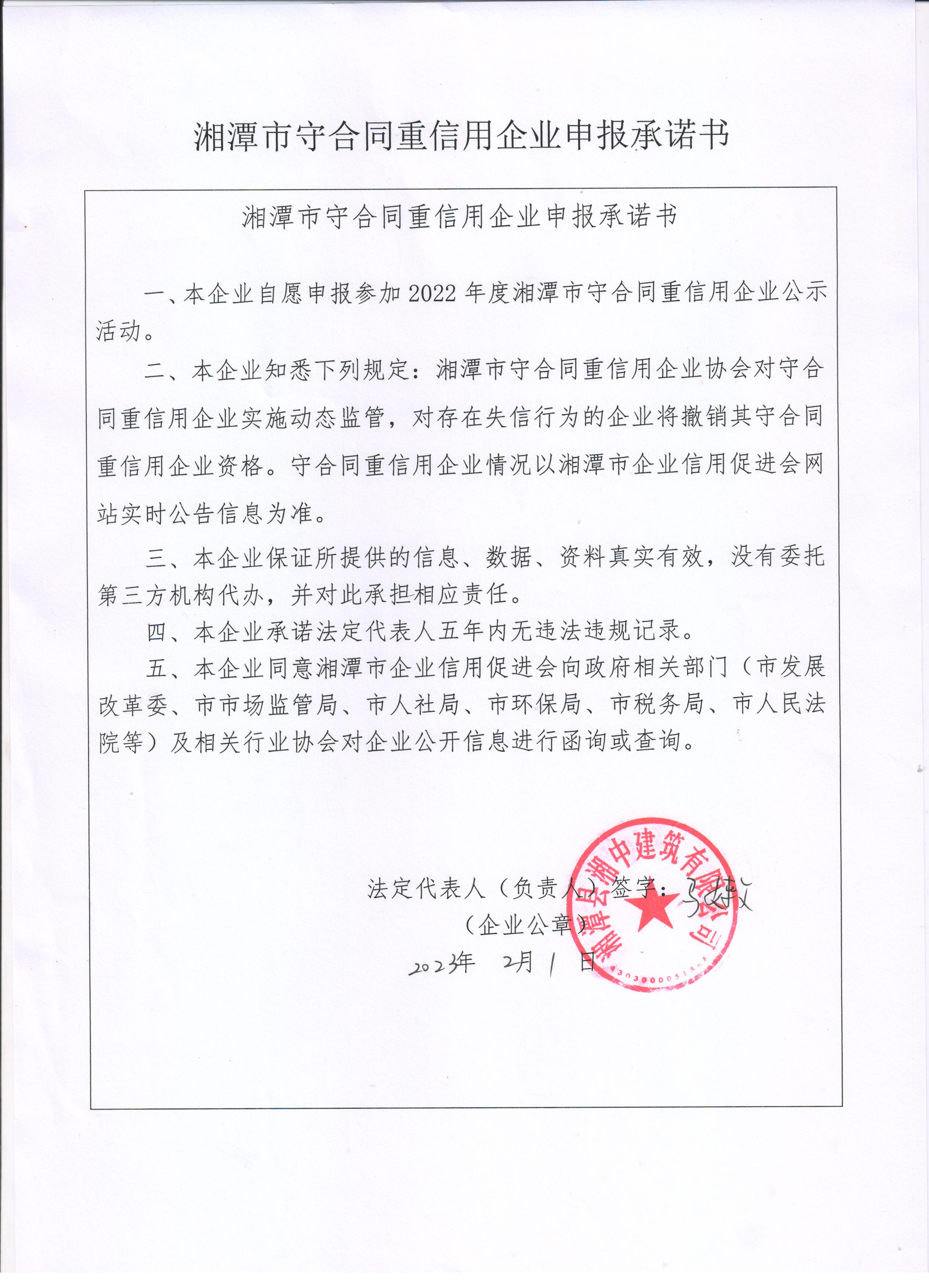 本企業(yè)根據(jù)《湘潭市守合同重信用企業(yè)申報規(guī)定》等編制 2022 年度企業(yè)信用報告書,并保證本報告書內(nèi)容真實、準(zhǔn)確、完整。